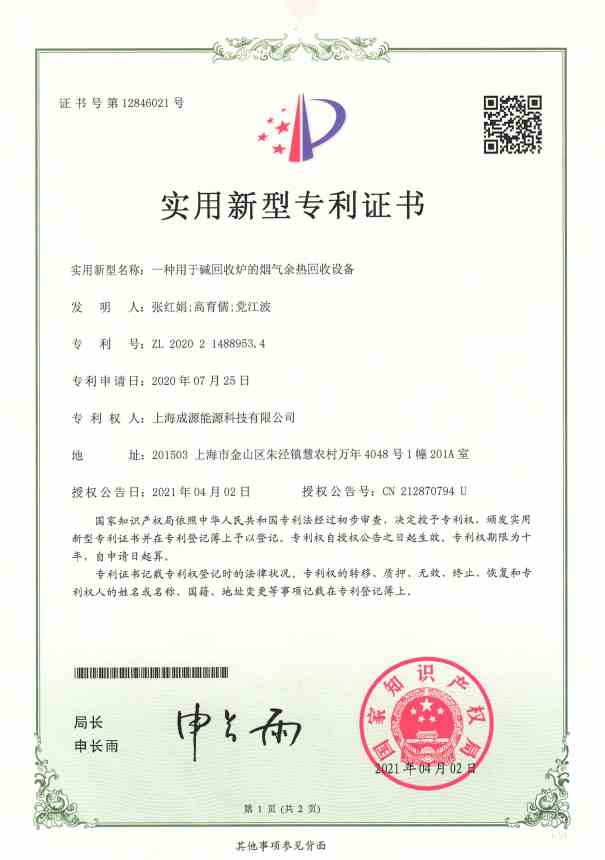 热烈祝贺我公司获得【一种用于碱回收炉的烟气余热回收设备】实用新型专利证书专利号:ZL 2020 2 1488953.4